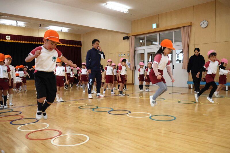 例えば、写真のように一列に並べて置いてある場合、両足ジャンプやケンケン、ケンケンの足を2回ずつ交互にするなど、たったこれだけで多彩なメニューを考えることができます。