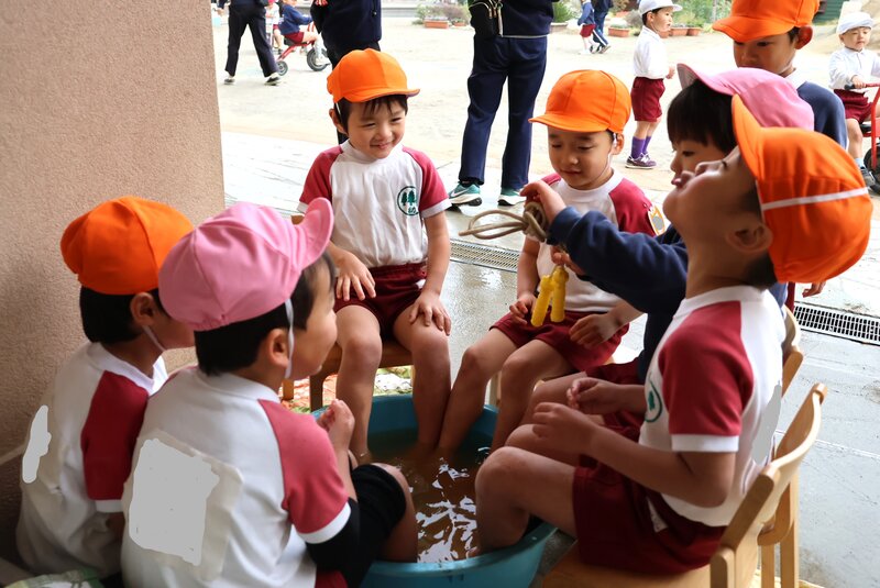 その「足湯」の存在を知ってか知らでか、園庭では各クラスのお子さまたちが元気いっぱいに走り回っていました。