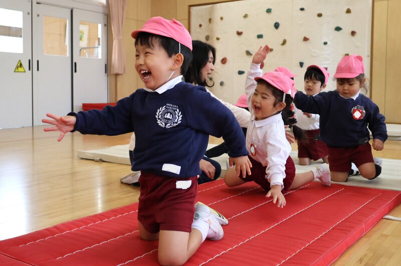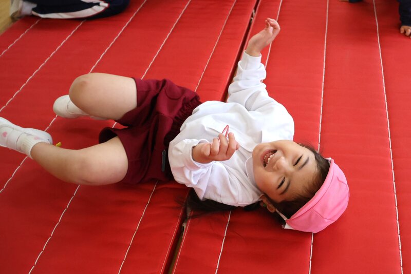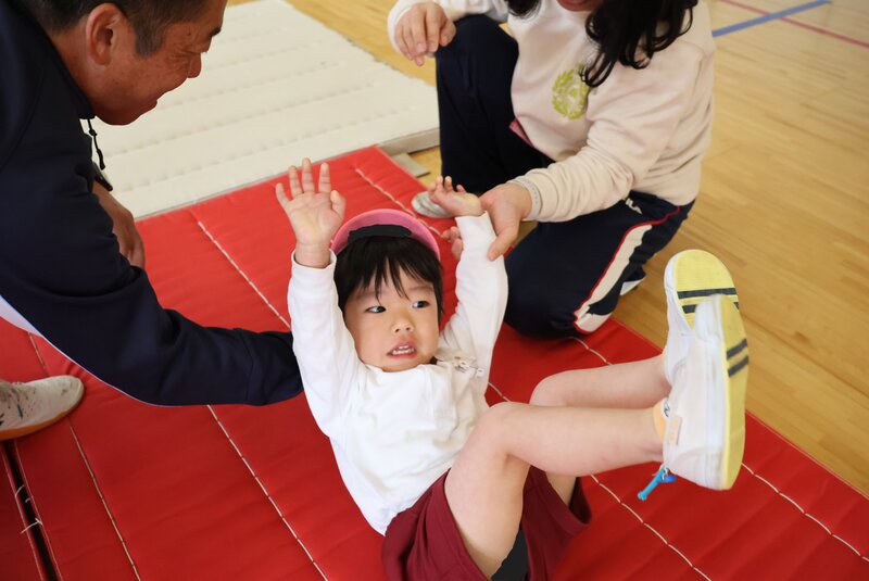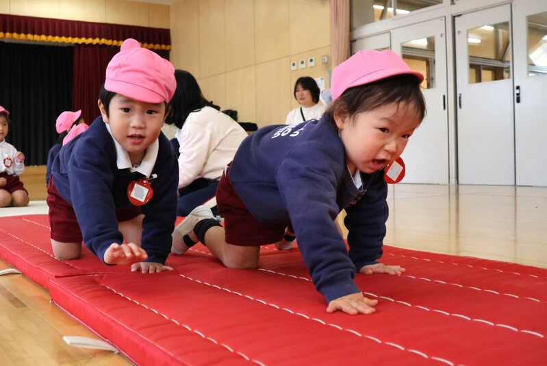 「いちご組」さんの体操メニューは、この前の年少さんとほぼ同じ内容でした。まずは、赤ちゃんハイハイからスタートして……、