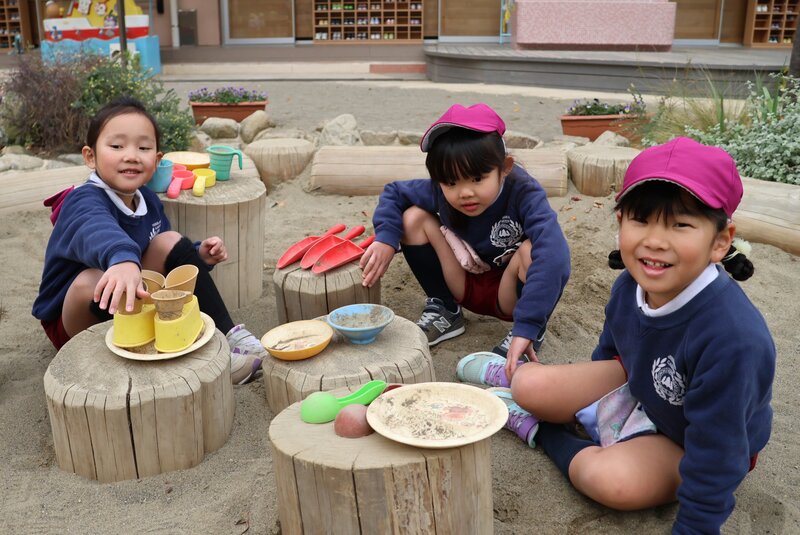 お砂場は、お友だちとの会話を楽しむ「サロン」の役割を果たしつつ、その一方でお子さまたちの「創造力」をたくましく育ててくれる場でもあります。園庭が新しくなって、間もなく1年……。