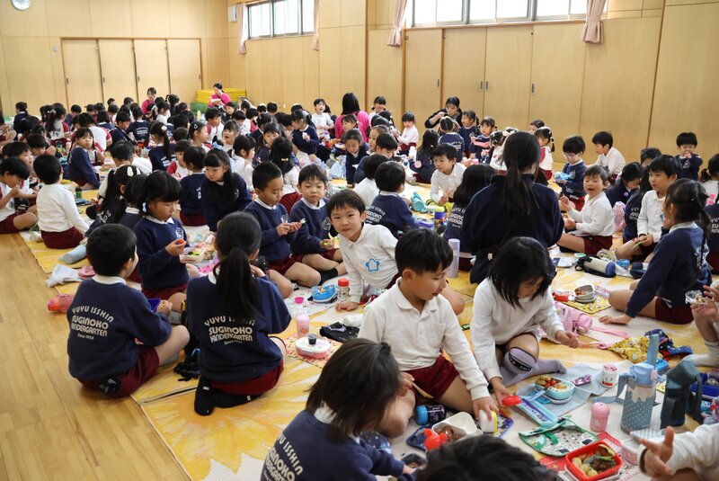 話が飛ぶようで申し訳ないのですが、ここで、きょうのランチの一場面を……。「お誕生日会」が開かれたホールで、年長さんと年中さんが「合同ランチ大会」を開催しました。もともとは、年中さんだけで開催する予定だったそうなのですが、そこに年長さんが飛び入り参加して、このような大会に発展したようです。
