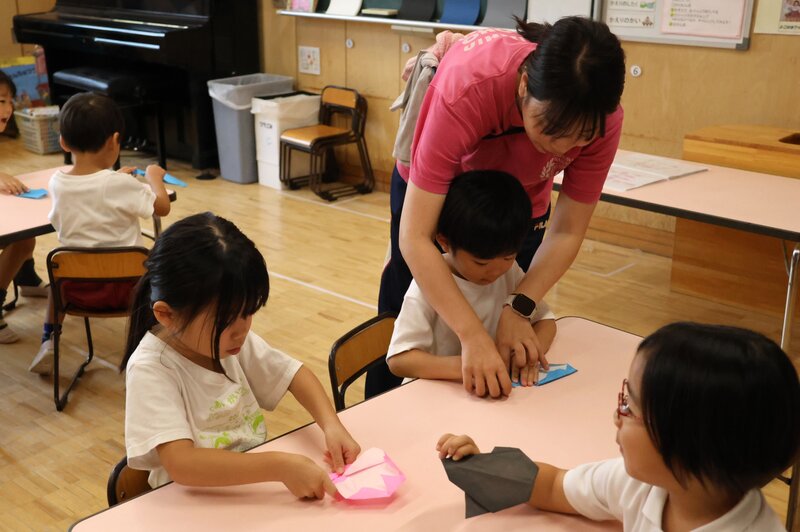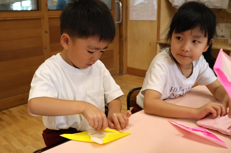 「折り紙」といえば、「ゆり組」さんは「折り紙」を使った製作を進めていました。テーマは、「おばけ」です。