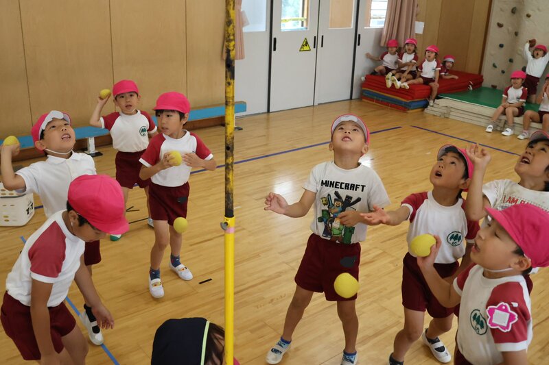 ですので、きょうは「玉入れ」にチャレンジしていました。クラスを2チームに分けたり、男子同士、あるいは女子同士に分けたりしつつ、ホールでは熱い戦いが繰り広げられ……、