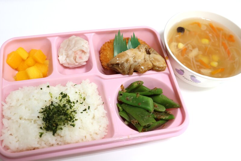 青菜ふりかけごはん、鶏の照り焼き、野菜コロッケ、カニシューマイ、いんげんのおかか和え、黄桃缶、はるさめスープ、457kcal