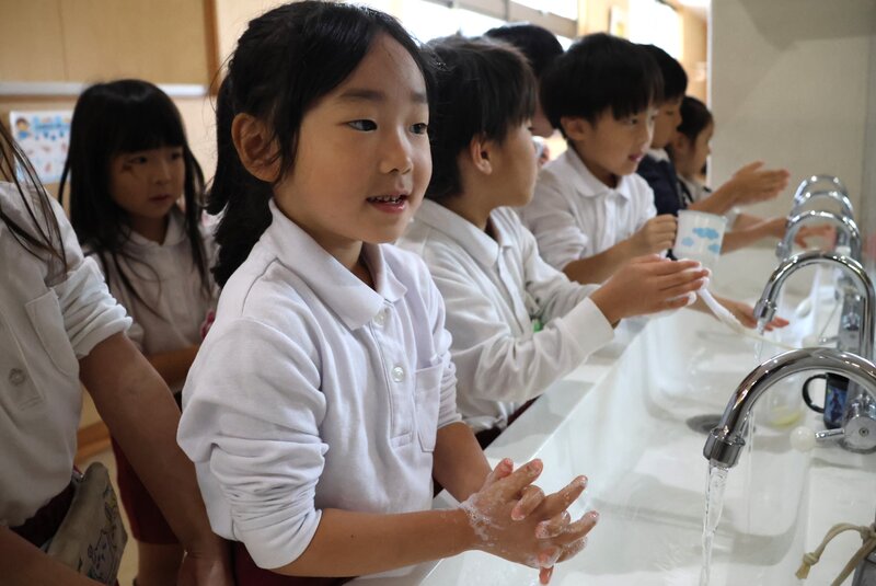 「手洗いチェッカー」といわれるマシンなのであります。きょうは、年長さんの「にじ組」さんと「ゆき組」さんが、この「手洗いチェッカー」を使って、ふだんの手洗いでちゃんと手が洗えているかどうかチェックをしてみました。おりしも、近隣の小学校ではインフルエンザによって「学級閉鎖」も発生しているとか……。感染症対策のためにも、手洗いはとても重要な手段ですから、しっかりチェックしていきたいところです。