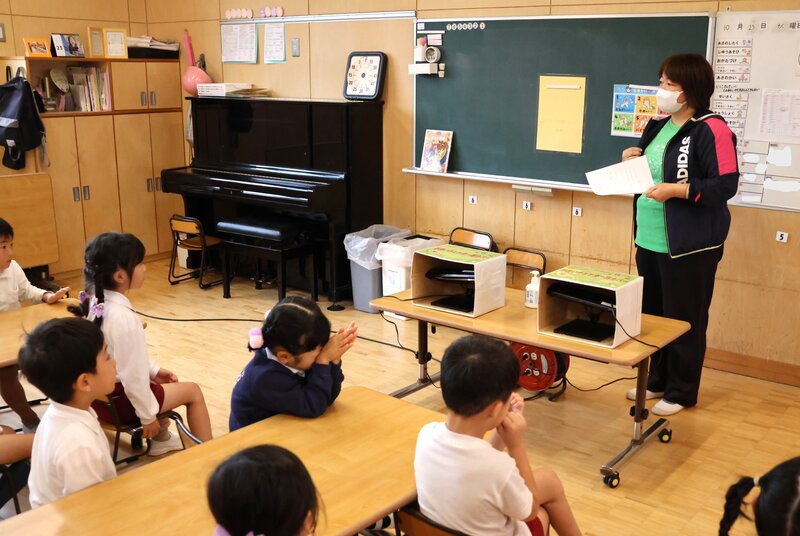 進行をつかさどるのは、杉之子幼稚園で日頃から子どもたちの健康状態を見守ってくれている看護師。こちらの看護師が、西区の研修を受けつつこの「手洗いチェッカー」を借りてきてくれました。