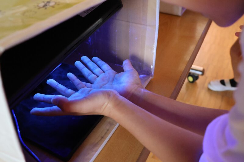 それを「手洗いチェッカー」の光にかざしますと、こうして菌で汚れた部分が青白く浮き上がるわけです。まるで「ブラックライト」みたいな感じです。