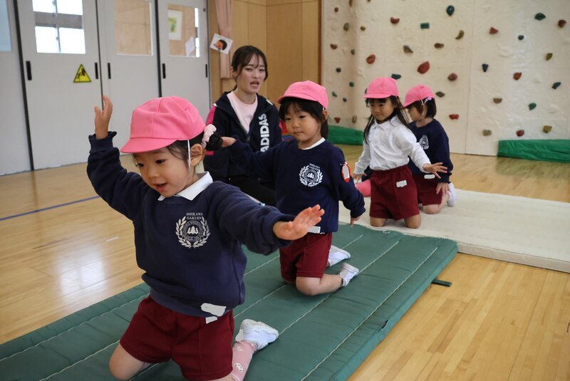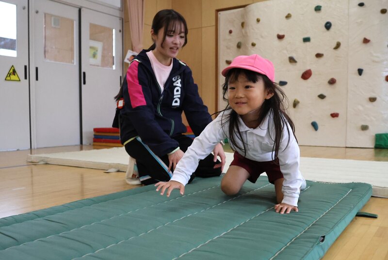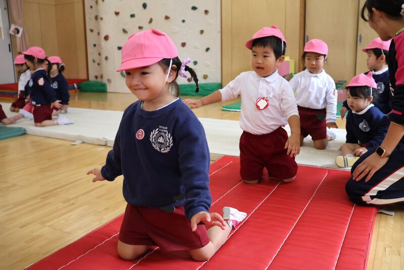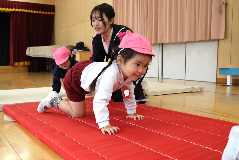 準備体操が終わったところで、きょうはマットを使ったメニューに入りました。まずは、「赤ちゃんハイハイ」からスタートして……、
