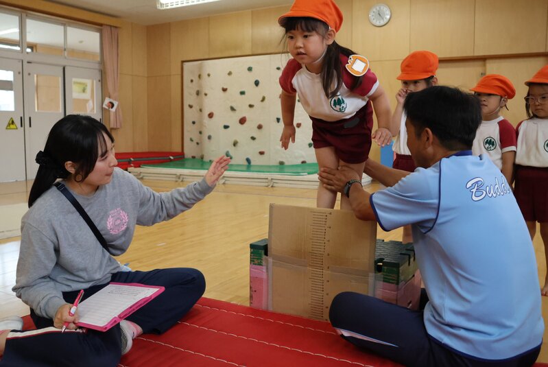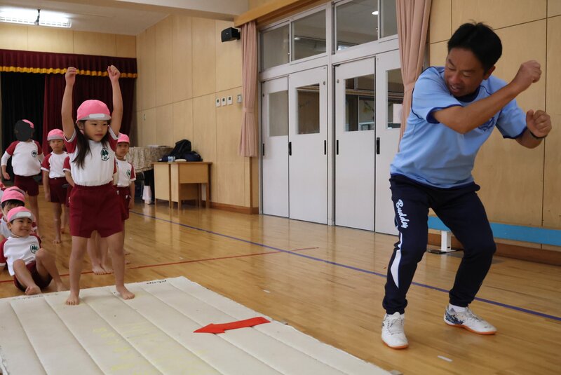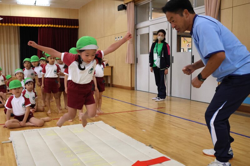 「立ち幅跳び」で飛距離を伸ばすコツは、両腕を大きく振って、その勢いを使って前に踏み出すこと。指導員の先生が、飛びかたのお手本をみせながら計測します。