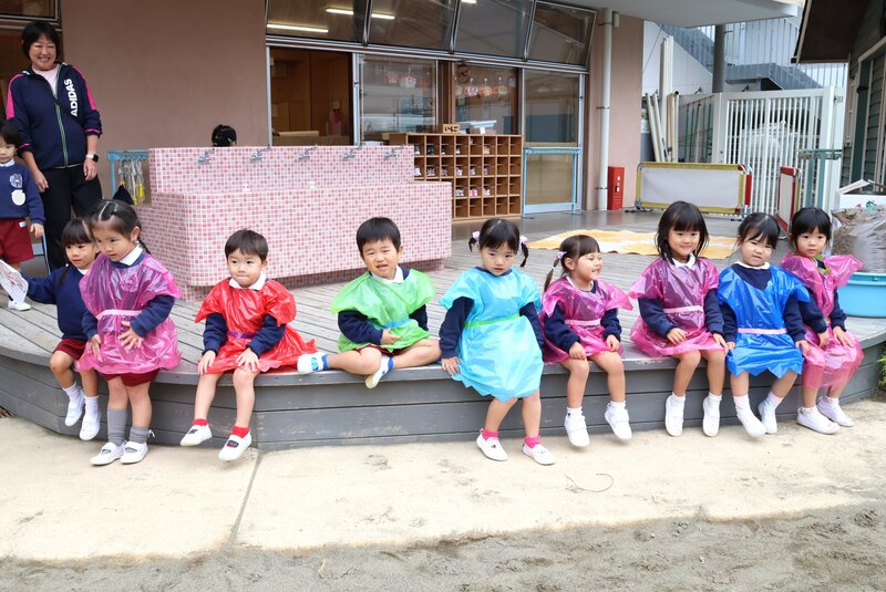 さあ、最後は「いちご組」さんに登場していただきましょう。こちらの写真は、朝の一枚。かわいらしい服を身に纏っていますね。どうやら、カラービニールでつくったようです。皆さん、とてもお似合いですよ。