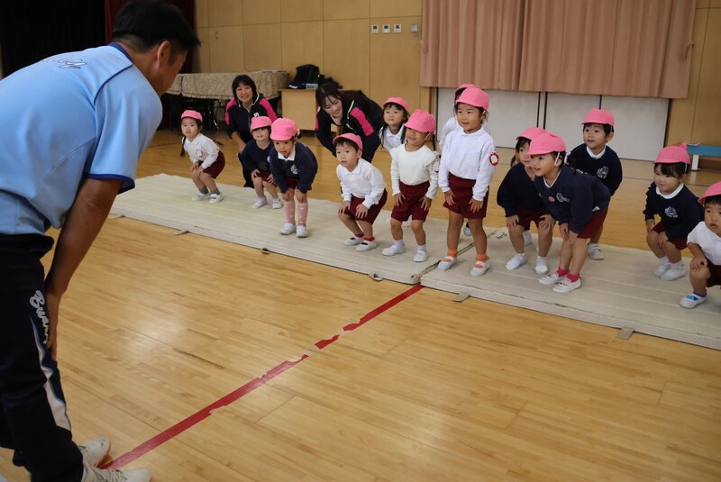 その「いちご組」さんは、きょうはじめての「体操指導」を体験しました。まずは、指導員の先生にご挨拶をしたあと、「体操座り」の練習です。「体操座り」は、基本中の基本ですからね。そして、さっそく「準備体操」がはじまりました。