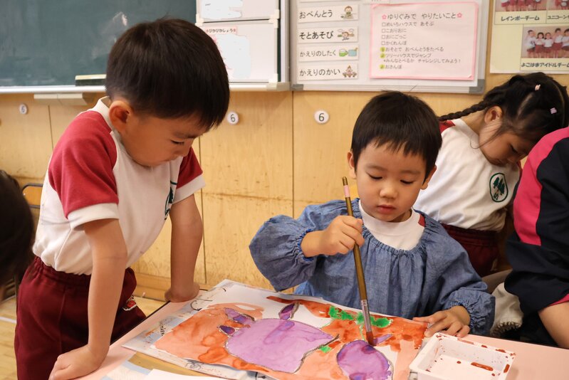 さて、この前の「お芋ほり」で収穫したお芋は、もう食べてみましたか?「お芋」の絵を描いている「ゆり組」さんでは、だいぶ「畑」の雰囲気ができあがってきました。お芋の色と葉の緑、畑の土の色が、とてもいい感じです。目に優しいといいますか、心が落ち着くのは、畑という「自然」が題材になっているからかもしれませんね。