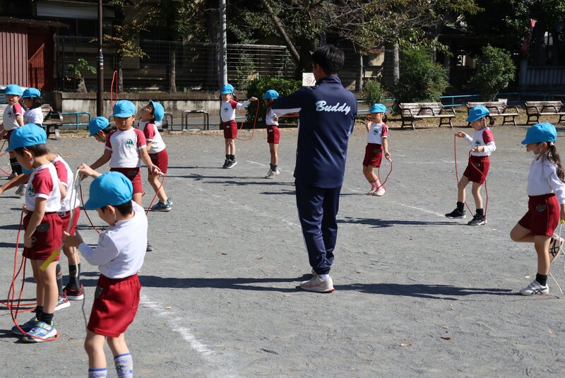年長さんの体操指導では、「なわとび」がはじまりました。