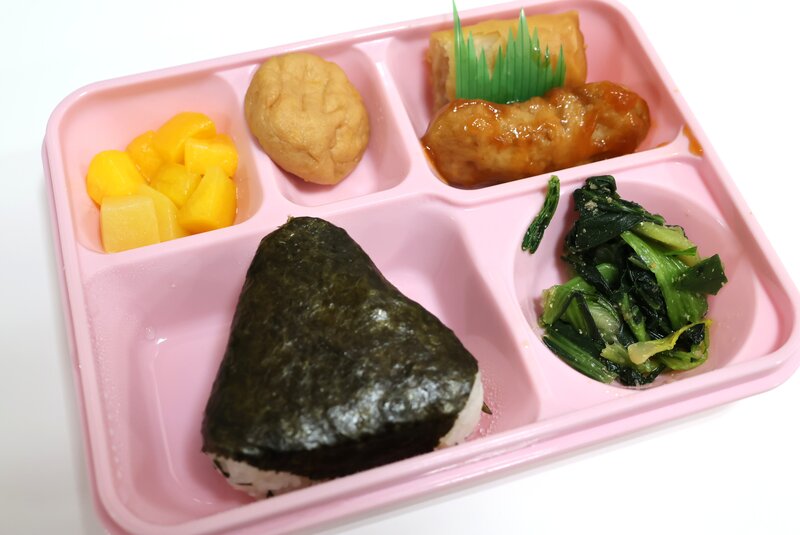 わかめおにぎり、春巻き、甘酢あん肉団子、ひとくちがんも煮、チンゲン菜のごま和え、黄桃缶、326kcal