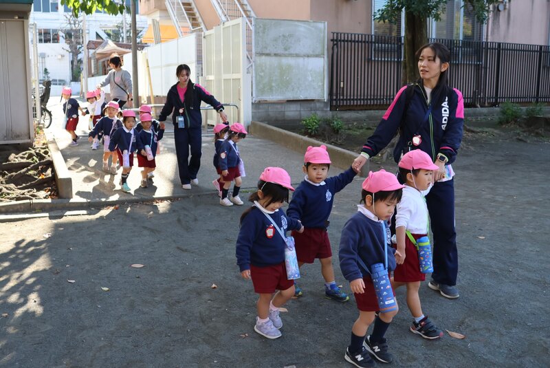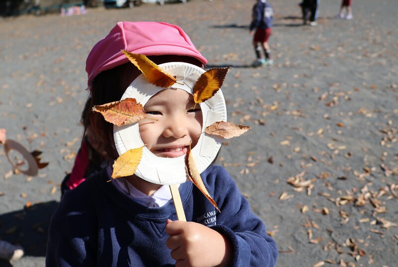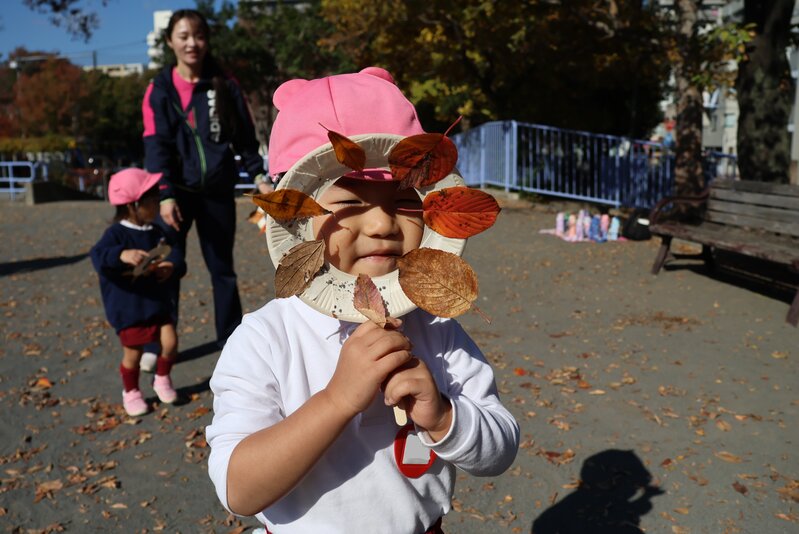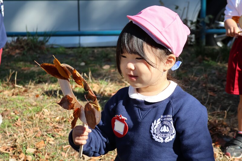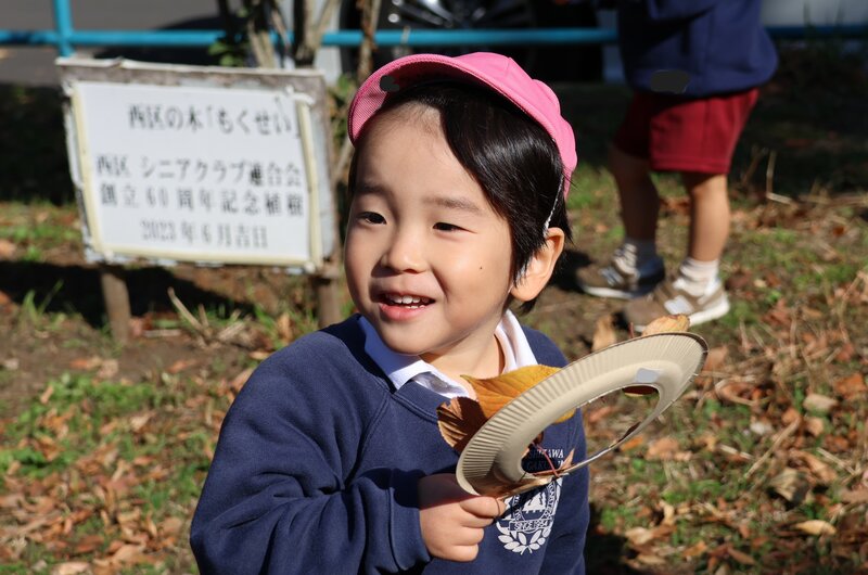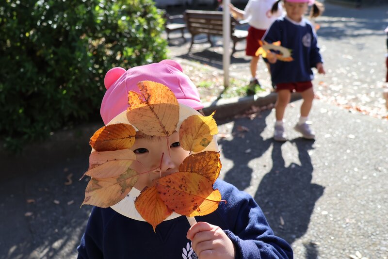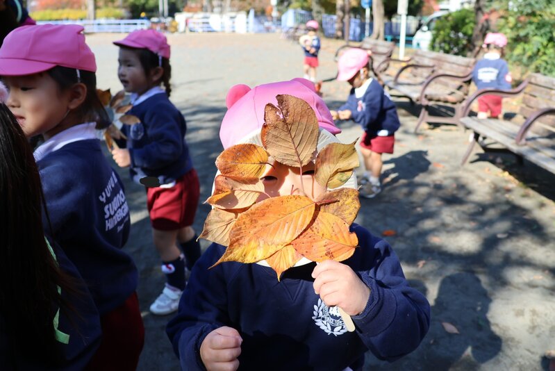 そして、ここからは「いちご組」さんをご紹介させていただきます。きょうの「いちご組」さんは、お隣の戸部公園へとお散歩にでかけました。いまの戸部公園は、樹々が色づいて秋の装いの真っただ中。そこにお出かけしたからには、何かしらの理由があるはず……。