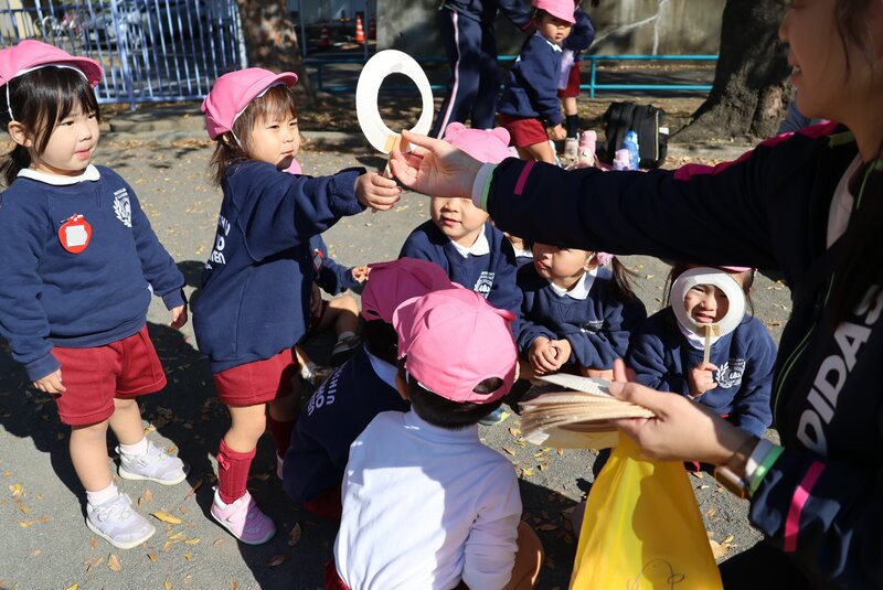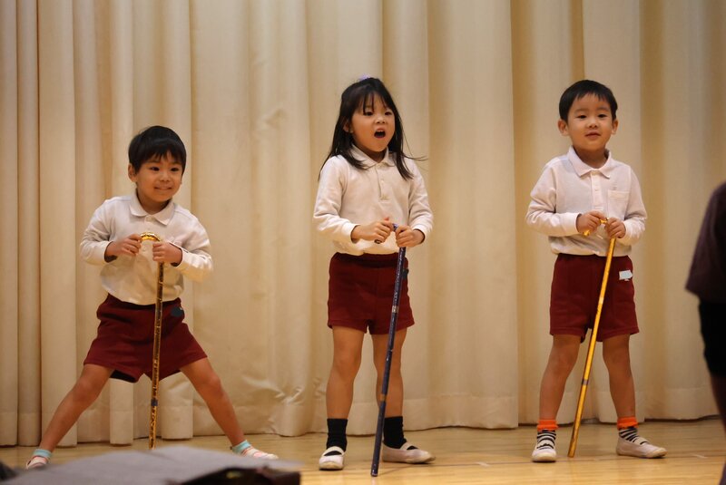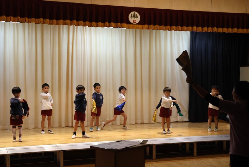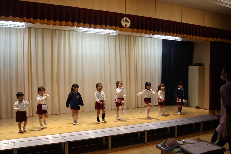 続いてご紹介するのは、年中の「ゆり組」さんです。「ゆり組」さんは、はやくから小道具を使った練習をはじめていましたので、小道具の使いこなし方にも進展がみられるのではないでしょうか。