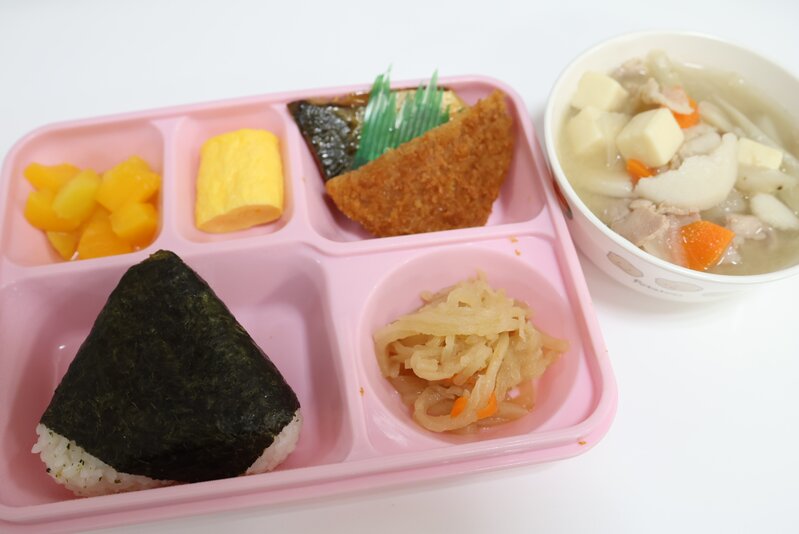 青菜おにぎり、さばの照り焼き、ハムカツ、たまごロール、切干大根煮、黄桃缶、あたたかな豚汁、411kcal