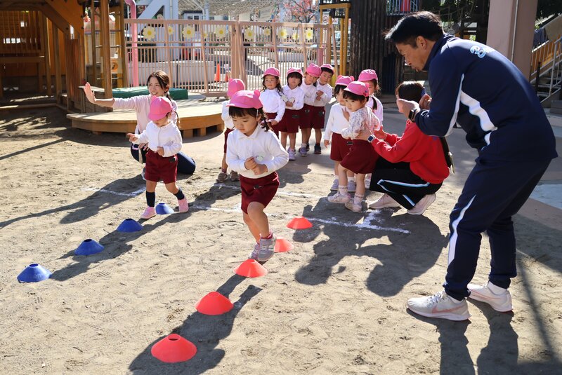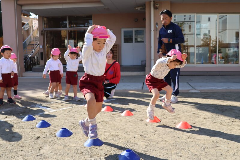 さらに、次は手を頭の上に持っていって、マーカーの間を「うさぎさんジャンプ」で通過します。両足を揃えて跳んでほしいところでしたが、それはまだ難しかったみたいです。でも、これができるようになるのが「成長」というもの。