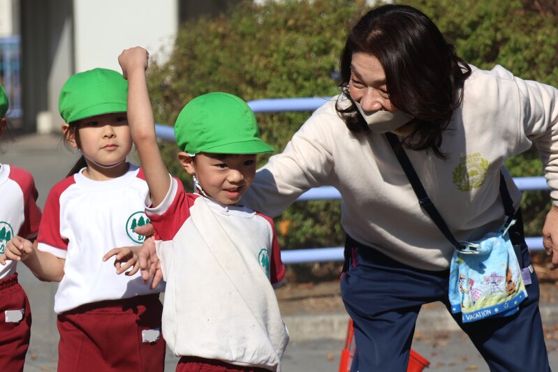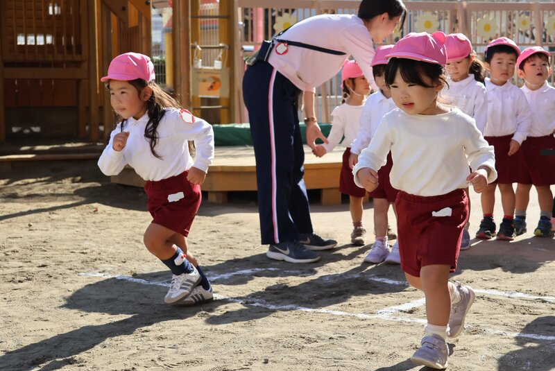 きょうは、年中さんのあとに「いちご組」さんの体操指導が園庭でおこなわれました。まずは、いつもどおり楽しい準備運動から。しかしながら、まだ準備運動の楽しさが十分に理解できていない感じ……。笑顔もありますが、その表情にはちょっと硬さが残ります。無理もありません。10月末以来、久しぶりの「体操指導」ですから、楽しさよりも「これから、何がはじまるのだろう……」という不安のほうが大きいのかもしれません。