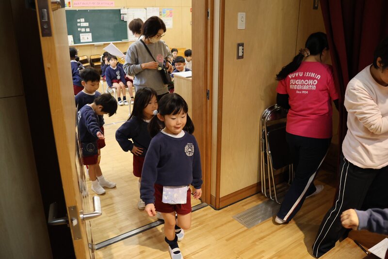 「生活発表会」では、ホールのすぐ隣の「ゆり組」さんのお部屋が「楽屋」になります。ここから、ステージにあがるわけですね。いま、まさに出番を迎えたお子さまたちがステージにあがろうとしているところです。