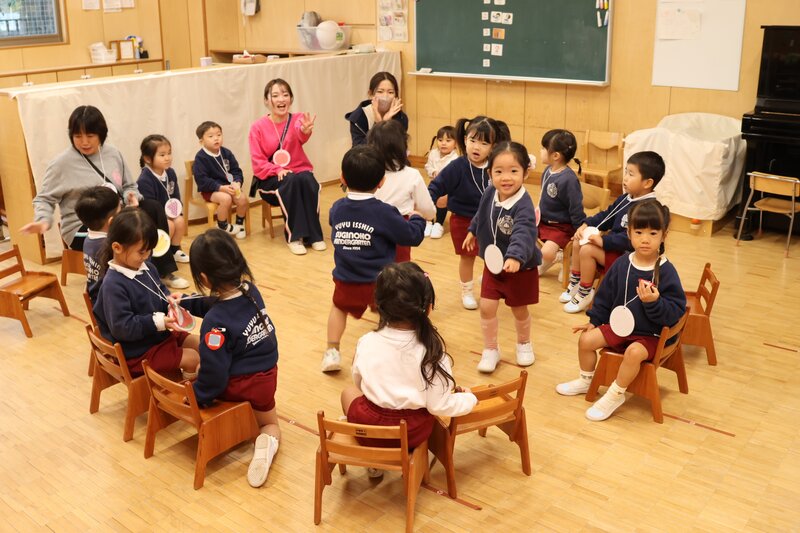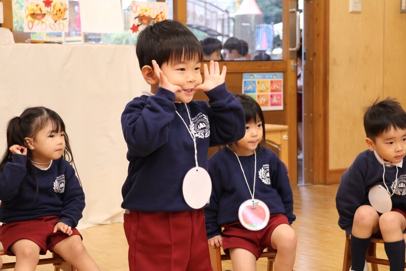「りんご」「ぶどう」「フルーツバスケット」……。ルールの把握がまだ十分ではありませんので、くだものの種類を伝える先生の「ささやき」がゲーム進行のカギを握っているわけですが、これがまた「いちご組」さんのかわいらしさを引き立てていました。これからルールがつかめてきますと、もっともっと楽しそうな表情を見せてくれることでしょう。