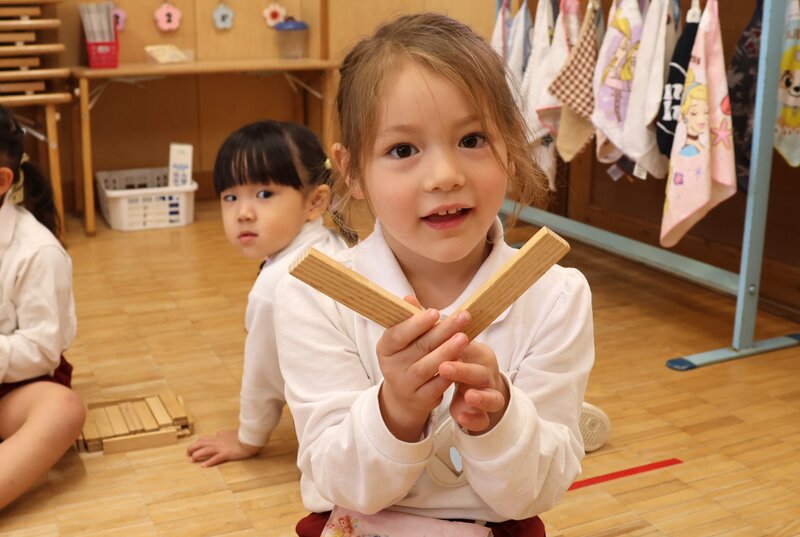 「うさぎ組」さんは、どうやら「完全休養日」。練習をお休みして、みんなでカプラ積み木を楽しんでいました。