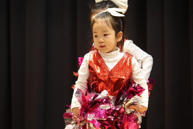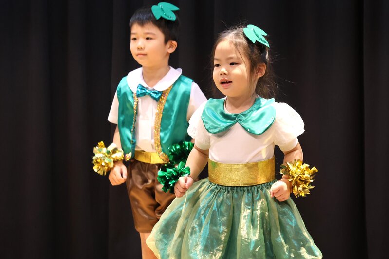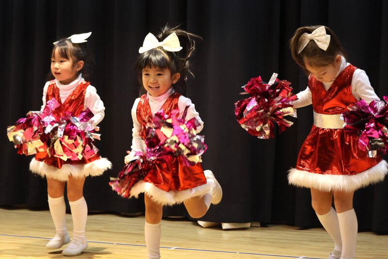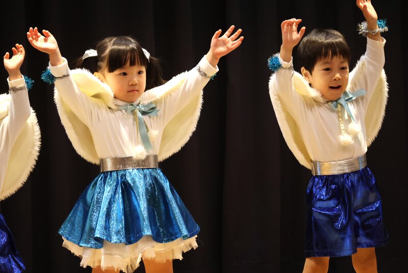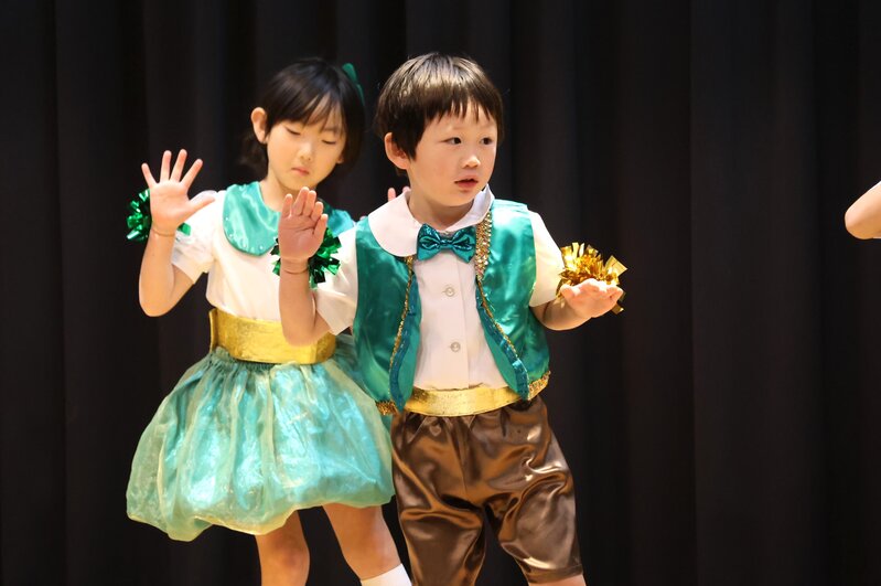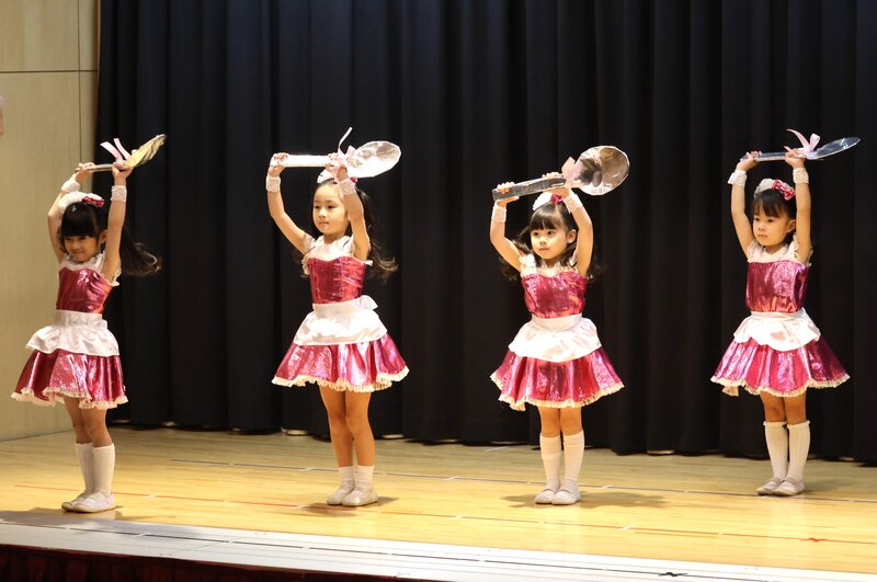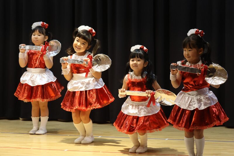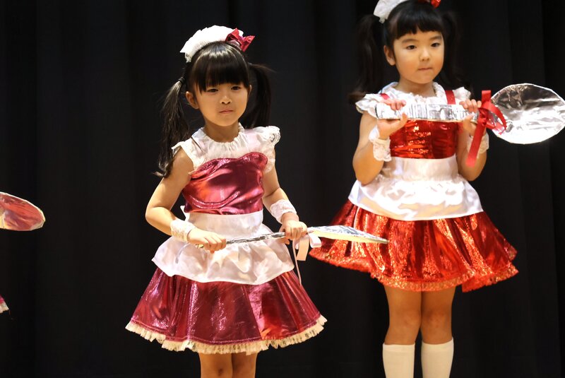 ピンクと赤という微妙に異なる色の衣装が、ちょっとしたアクセントを生み、お子さまたちのステージングを引き立ててくれます。