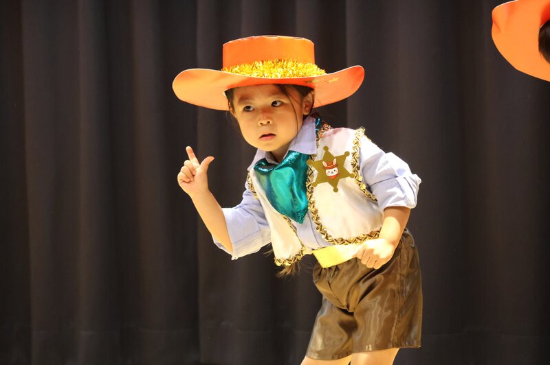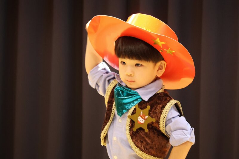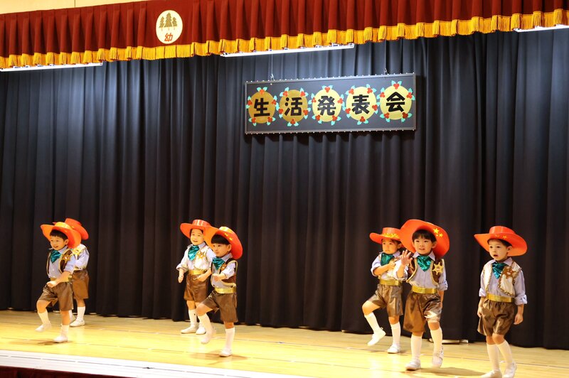 トップバッターは、「うさぎ組」さん。かわいらしいカウボーイ姿で登場です。こちらのお子さまたちが踊る曲の曲名は、この衣装のとおり「ちびっこカウボーイ」。カントリーミュージックを思わせる軽快な曲調が、元気な「うさぎ組男子」には、ぴったりです。