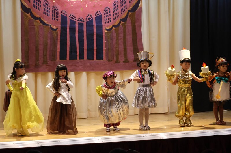 そして、きょうの「トリ」を務めますのは、年長の「にじ組」さんです。演じる劇は、「美女と野獣」。ステージ開始を前にして、みんなで円陣を組んで気持ちをひとつにまとめます。先生の「にじ組さん、みんなでがんばろう!!」の声に「おーっ!!」と応えるお子さまたち。さあ、言語劇「美女と野獣」のはじまりです。