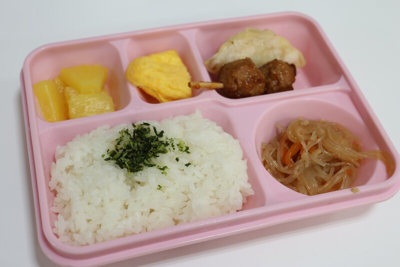 青菜ふりかけごはん、海鮮揚げギョウザ、つくね串、オムレツ、チャプチェ風、パイン缶、353kcal