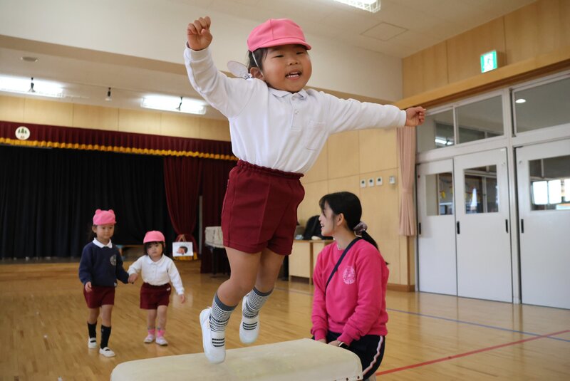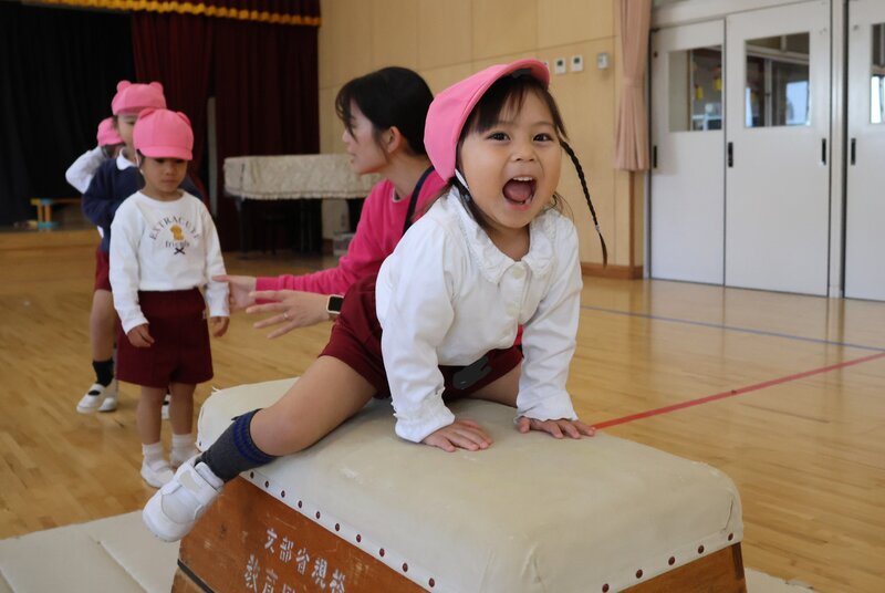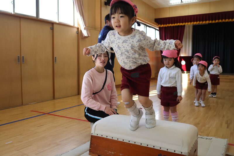 「跳び箱」は、一段を使ってその上からジャンプです。「いちご組」さんにとりましては、一段の高さだって登るのに体力を使います。