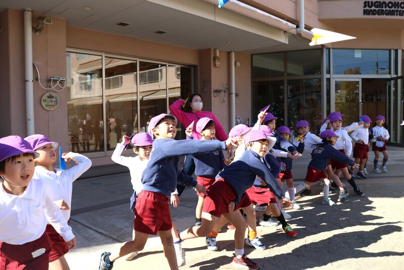 その「としょしつ」の外では、「つき組」のお子さまたちが自分でつくった「紙飛行機」を飛ばしていました。あいにく風が強かったので、安定したフライトは期待できなかったようですが、ほんの一瞬ではあるものの自分がつくった「紙飛行機」が空を飛ぶ姿をみて、お子さまたちはみんなうれしそうな表情を浮かべていました。