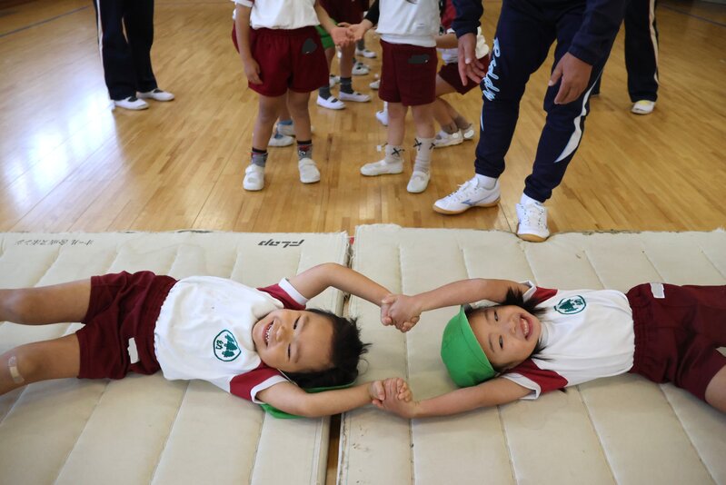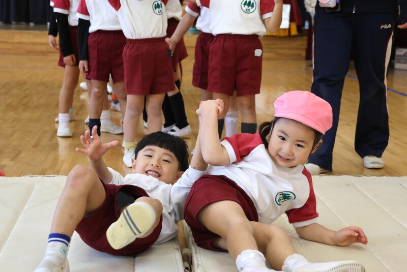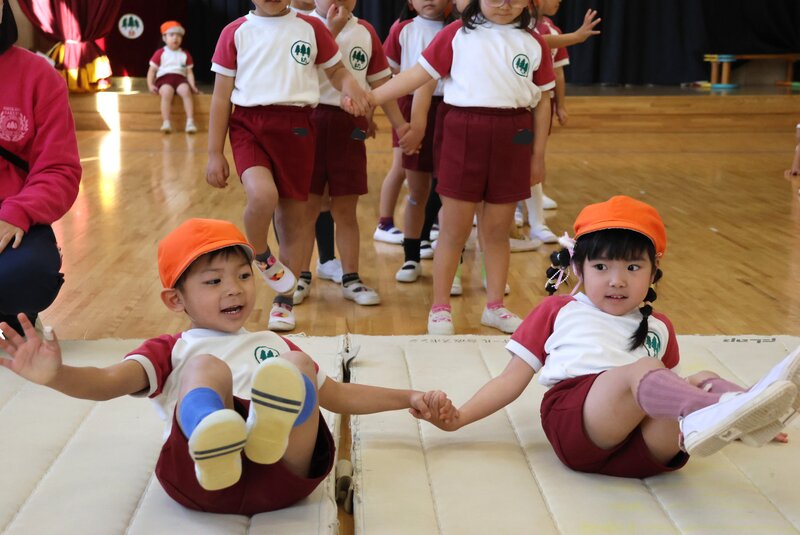 「前転」のあとには、面白いメニューが続きました。こちらは、お友だちと手をつないで回る「なかよしお芋コロコロ」。この前、年少さんがチャレンジしていました。年少さんに比べますと、さすが年中さんはスピード感があります。でも、スピードがあるので、「分解」するのもはやかったりして……。