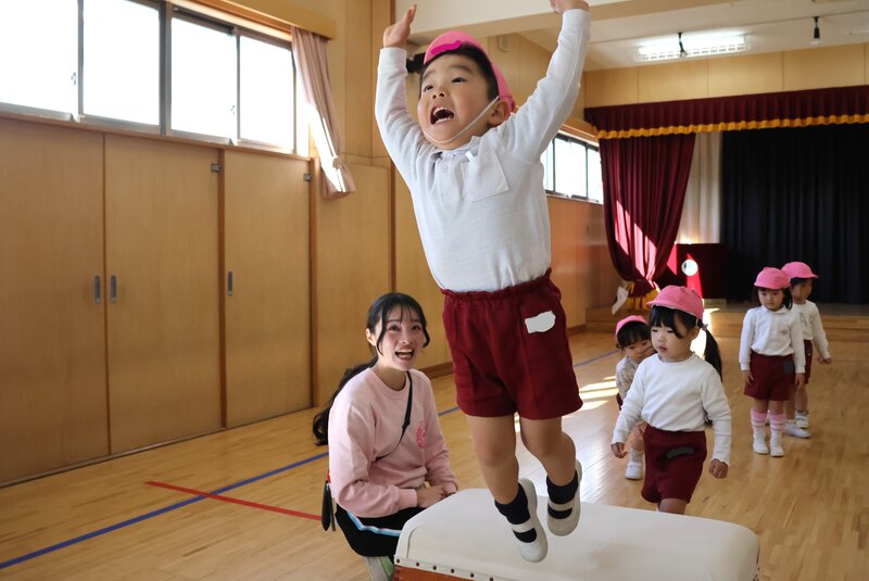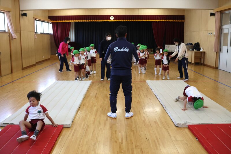 そして、きょう最後にご紹介したいのは、こちら。年中さんと「いちご組」さんの「体操指導」です。では、まず年中さんからご紹介しましょう。きょうのテーマは、「マット運動」です。最初にトライしたのは、「でんぐりがえし=前転」です。