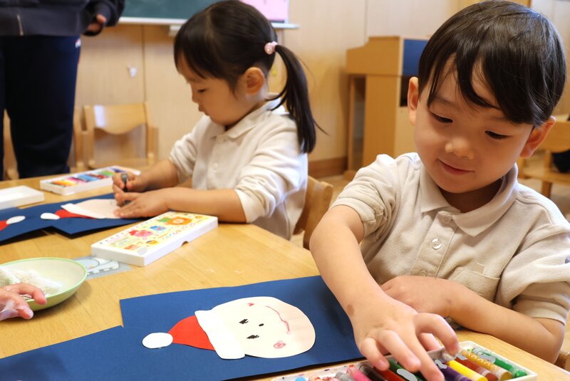こうして、クレヨンでお顔を描いていました。「くま組」さんのお部屋には、表情豊かなサンタさんたちが溢れていて、一足はやく「クリスマスモード」に入った感じでした。