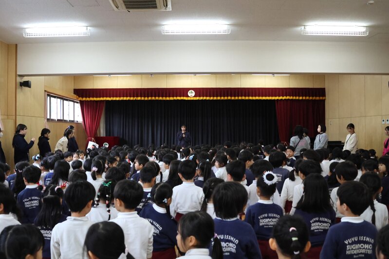 「終業式」のオープニングは、「おはようございます」のごあいさつ。お子さまたちの元気のいい声が、ホールの中に響きわたります。