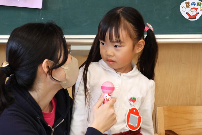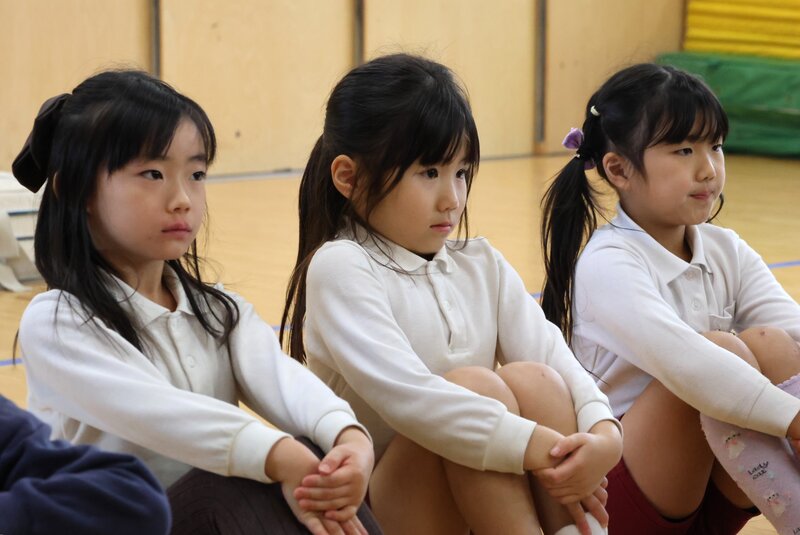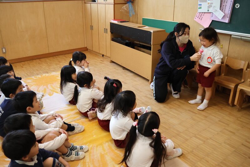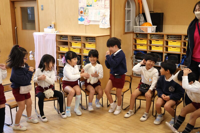 もちろん、「いちご組」さんも「先輩」たちの横にしっかりと席を確保して参加です。「いちご組」さんは、9月にフルメンバーによる一斉スタートを切り、きょうの「終業式」まで2学期とともに歩んできました。その「歩み」を振り返るように、司会の先生が2学期の出来事をお子さまたちに尋ねます。