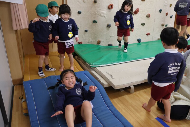 マットでは、自分たちでセットしたのでしょうか、体操指導のときと同じように傾斜をつけて「前転」の練習をするお子さまたちも……。ちなみに、ここでも年少さんから年長さんまで一緒に練習をしていました。