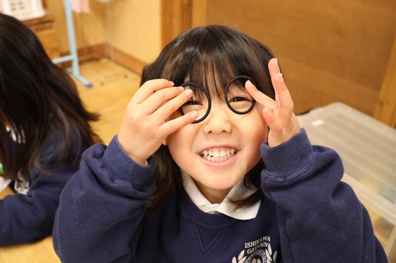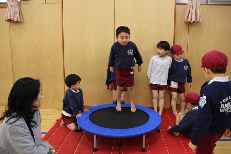 さて、きょうの午前中は、雨で園庭のコンディションが悪かったので、ホールが開放されました。そこでは、年少さんから年長さんまで、学年を超えて一緒にあそぶ姿が……。年少さんにとりましては、「先輩」たちの遊びから学ぶいいチャンスです。