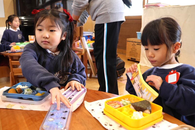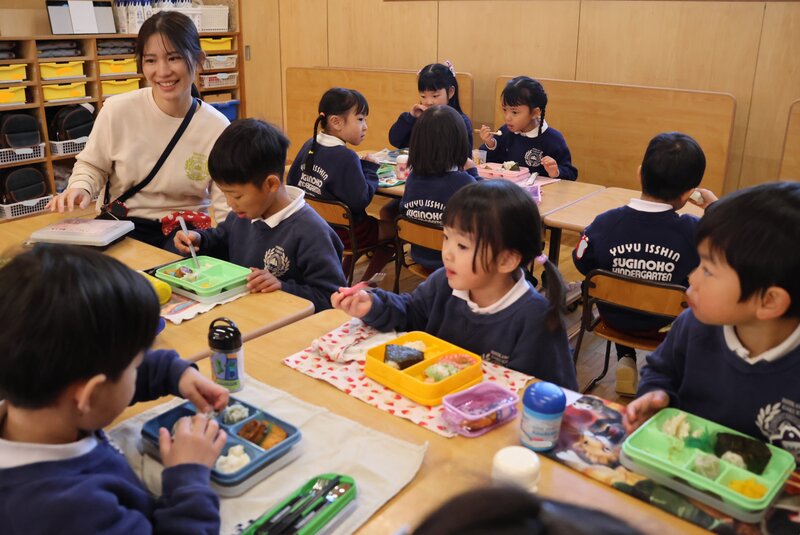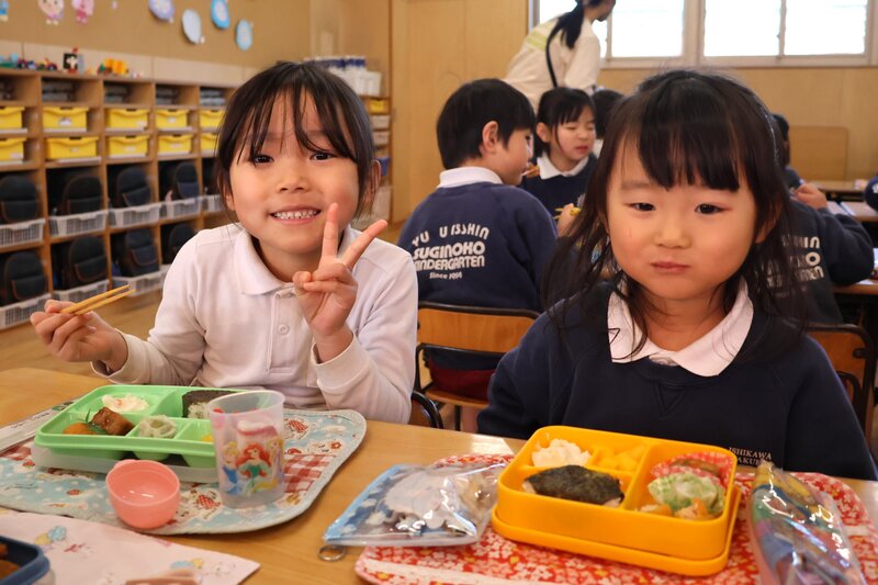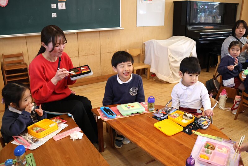 「いちご組」さんの先生です。「すぎのこ de あそぼう」に参加されたお客さまのお見送りを終えたjimjimに「きょうは、つき組さんといっしょにランチをします」とのこと。しかも、全員いっしょではなく、「いちご組」さんの半数が年長の「つき組さんへ行き、「つき組」さんからも「いちご組」さんにやってくるという「トレード方式」での合同ランチと聞いて、「なかなか面白い企画だな」と思いました。