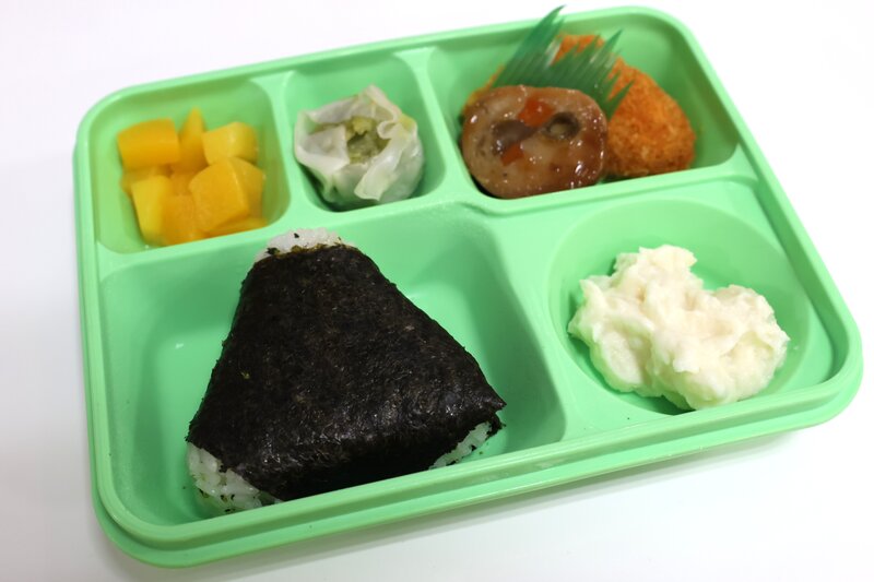青菜おにぎり、サーモンフライ、八幡巻き、ほうれん草入りシュウマイ、ポテトサラダ、黄桃缶、378kcal