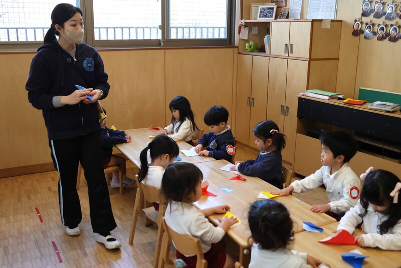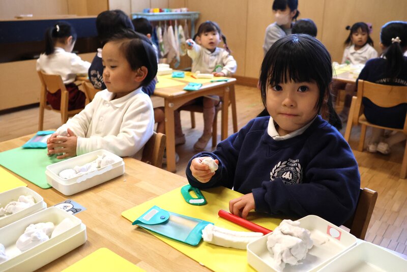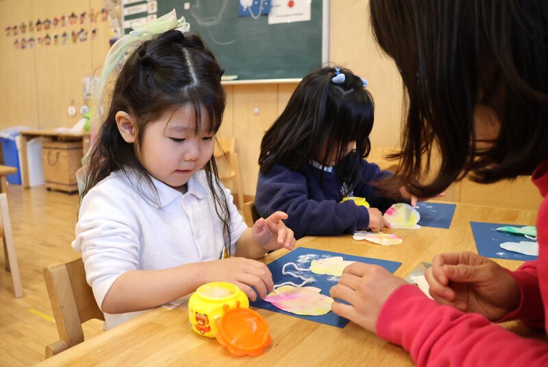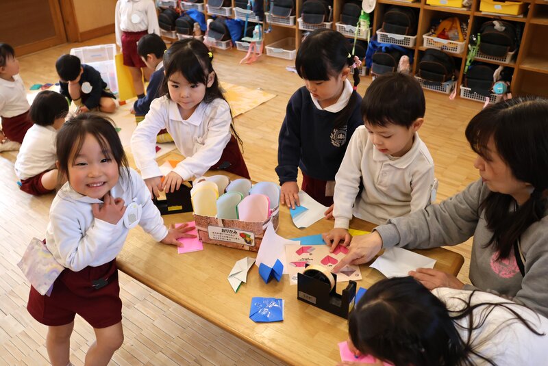 「りす組」さんは、折り紙を使った製作をしていました。机の上にあるのは、赤と青と黄色の折り紙。この時期の製作ですから、おそらくは節分にちなんだ「鬼」の製作だと思われます。きっと、年少さんらしいかわいい「鬼」さんたちに仕上がることでしょう。
