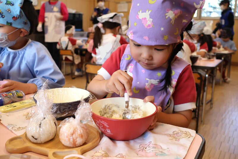 年中さんの「つくってたべよう」では、「おにぎり」をつくります。具材は、「鮭」「塩こんぶ」「シラス」の3種類。