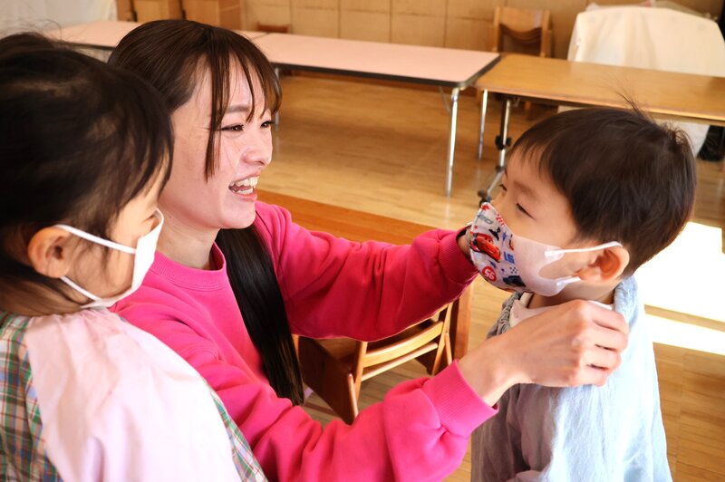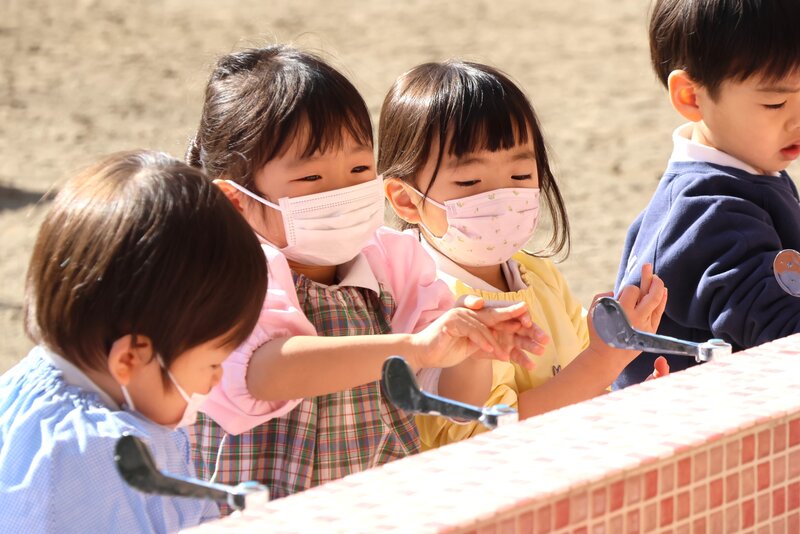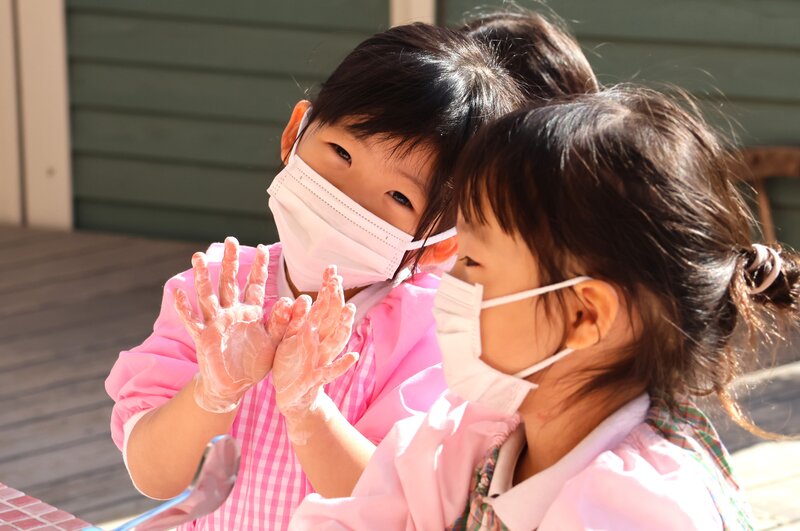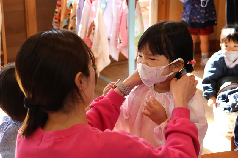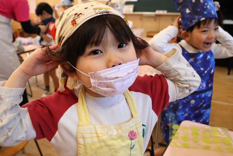 先生にお手伝いをしてもらいながらエプロンとマスクで身支度を整えたら、まずは手洗いです。
