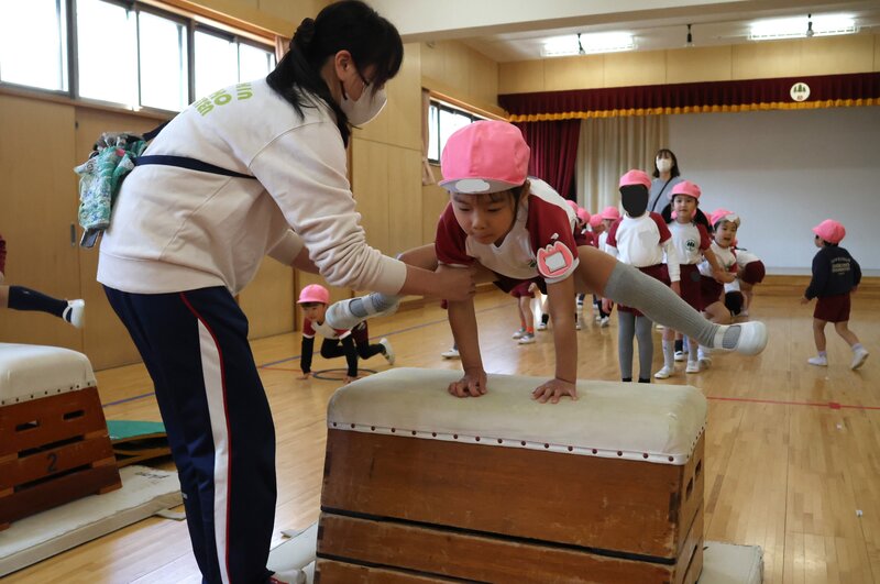 年中さんは、金曜日なので「体操指導」がありました。きょうのテーマは、「跳び箱」です。