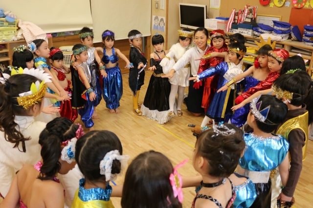 さあ、いよいよ「生活発表会」最後のクラスの登場です。年長の「つき組」さんが、ステージに上がりました。 「つき組」さんのクラス目標は、「ほめてもらって、かんどうのなみだをながしてもらえるように、きょうりょくしてたのしく、みんなでちからをあわせてがんばるぞ!!オー!!&じょうずだねって、はくしゅをしてもらオー!!」です。このクラス目標って、ちょっと欲張りなようでもありますが、きっと子どもたちから出たたくさんの意見を担任の恵美先生がうまくまとめてあげたのだと思います。そのあたりに、恵美先生の子どもたちへの思いが感じられるクラス目標です。 そのクラス目標をクリアするために「つき組」さんが演じる言語劇は、「リトル・マーメイド2」です。劇を決めるにあたっては、他のクラスと同様にさまざまな候補が上がったようです。最終的に6つまで絞り込まれたところで劇を決めるために採用した方法は……。 何と、「くじ引き」でした。これも、子どもたちと相談した結果なんです。 劇が決まり、練習を重ねて迎えたきょうの本番。 ステージに上がる前に、みんなで輪になって気持ちをひとつにする「つき組」さんの子どもたち。もう、この瞬間に「つき組」さんの子どもたちの心は、劇の成功に向かって突き進みはじめました。