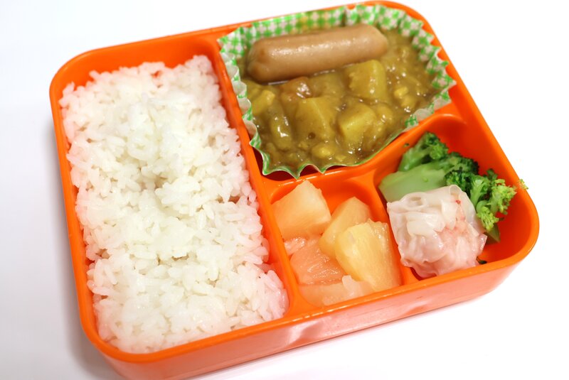 カレーライス、ウィンナー、かにシュウマイ、ブロッコリー、パイン缶、419kcal