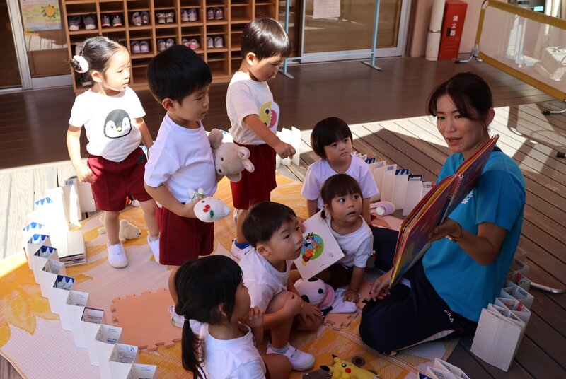 その奥では、もう一人の先生が絵本の読み聞かせをしていました。なんだか、「秋」らしくていい感じです。