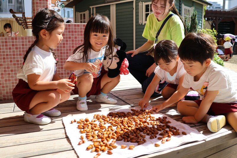 そして、「秋」といえばこちら。「どんぐり」です。きょうは、年中さんのお友だちが「どんぐり」をたくさん持ってきてくれたので、先生がきれいに洗って乾燥させていました。このあと「どんぐりくん」たちは、いったいどのように姿を変えていくのでしょう。それも楽しみですね。