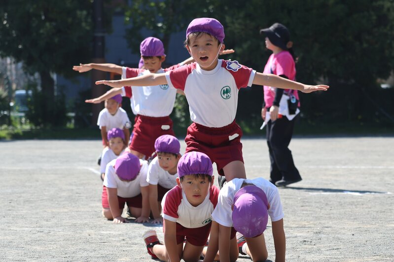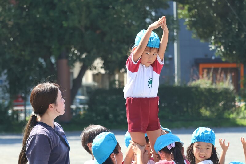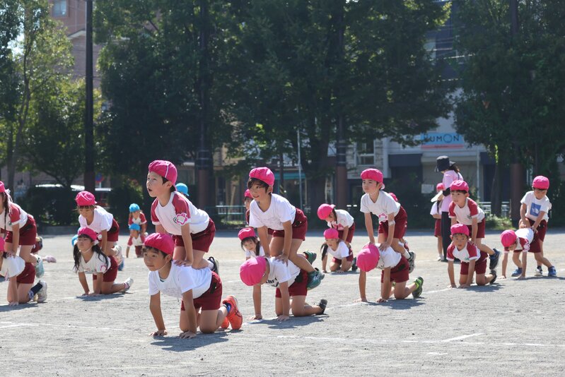 そして、最後はこちら。早めのランチを終えて戸部グラウンドへと遠征してきたのは、年長組の皆さんです。jimjimが到着したときには、「パラバルーン」の演技が終わり、「組体操」がはじまるところでした。